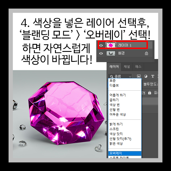 4. 색상을 넣은 레이어 선택후, '블랜딩 모드' > 오버레이' 선택 하면